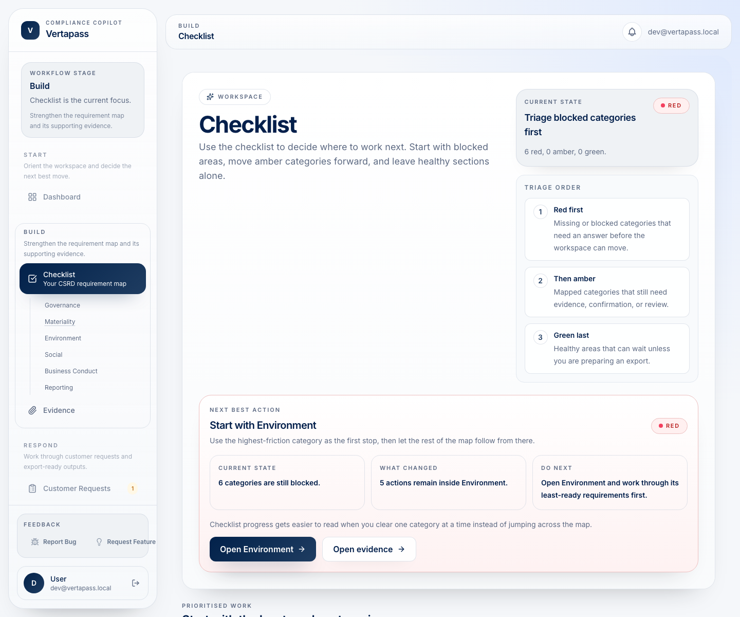 Start with a short assessment, see what actually applies, and move into a calmer workspace that shows the next best action, the proof behind it, and the export path ahead.